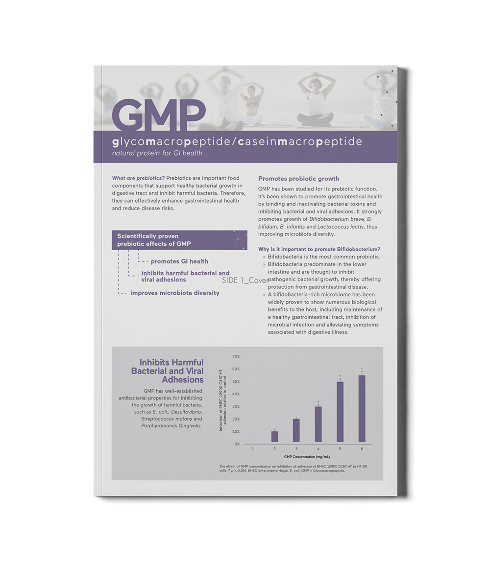 Agropur offers BiPRO GMP 9000 (glycomacropeptide), a protein derived from milk that offers prebiotic functions. It’s been shown to promote a healthy gut by binding bacterial toxins and inhibiting bacterial and viral adhesions. GMP also supports the growth of healthy bacteria.